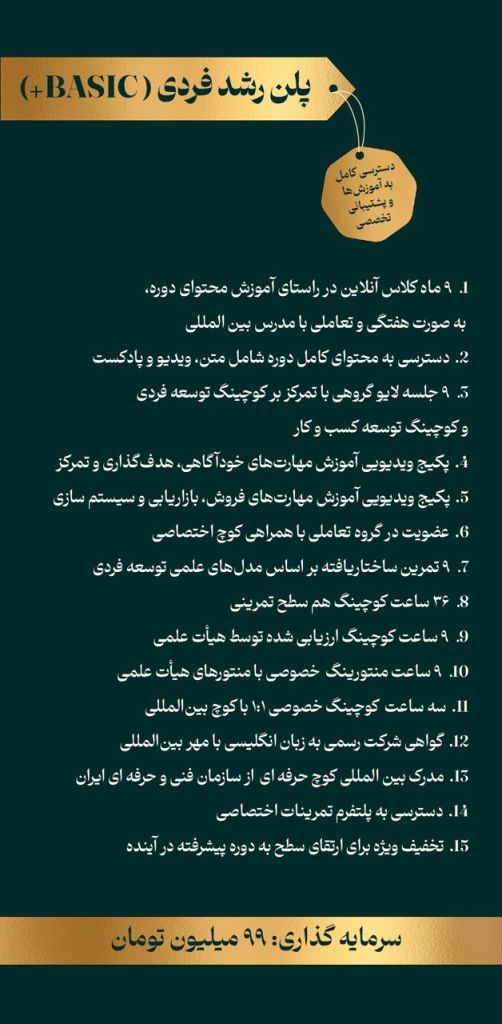 چه میشود اگر همین حالا شروع کنید؟ اگر بتوانید موانعی را که شما را از دستیابی به موفقیت واقعی بازداشتهاند، شناسایی و برطرف کنید، چه تغییری در زندگیتان ایجاد میشود؟ اگر مهارتهایی یاد بگیرید که نهتنها مسیر شغلیتان را متحول کند، بلکه شما را به فردی اثرگذار و الهامبخش تبدیل کند، چه احساسی خواهید داشت؟ دوره کوچینگ توسعه فردی و کسبوکار، کلید شما برای رسیدن به نسخهای قویتر، آگاهتر و موفقتر از خودتان است. 💡 اولین گام را بردارید و آیندهای را که شایسته آن هستید، بسازید!